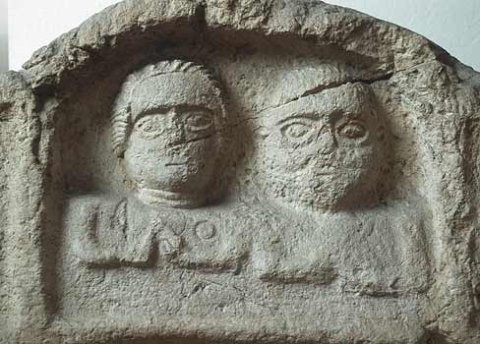 - Unter Rundgiebel zwei Brustbilder (Ehepaar). Links einheimische Frau: zwei Halsreifen, Fibeln (?). Rechts bärtiger Mann. im rechten Seitenfeld Ritzzeichnung (Blüte ?).