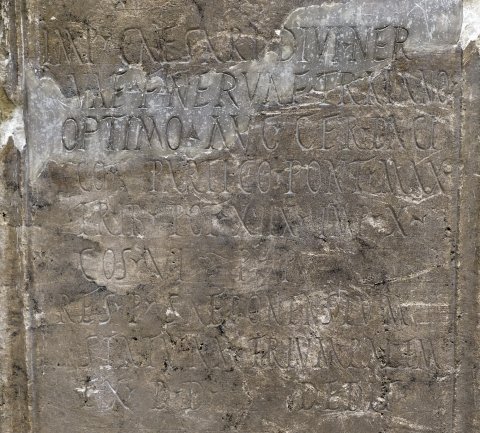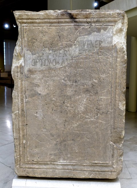 - Imp(eratori) Caes(ari) d[ivi Ner]/vae f(ilio) Ne[rv]ae Traiano / [Optimo A]ug(usto) Ger(manico) Daci/co Part(h)ico pont(ifici) max(imo) / trib(unicia) pot(estate) XIIX imp(eratori) X / co(n)s(uli) VI p(atri) p(atriae) / res p(ublica) Saeponensium / statuam triump(h)alem / ex d(ecreto) d(ecurionum) dedit