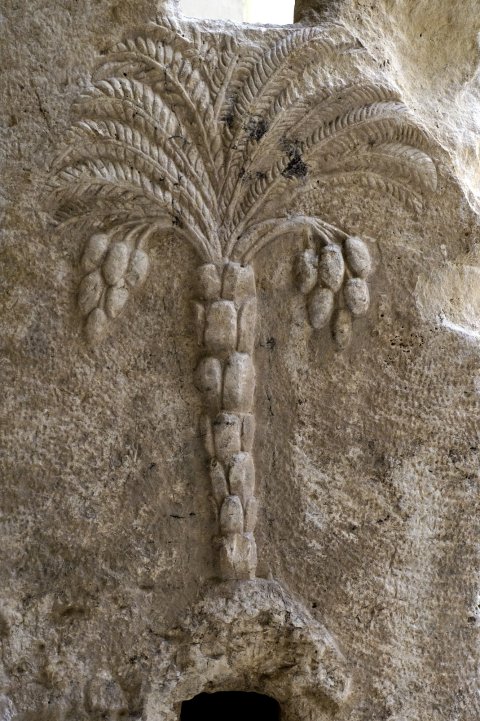- Auf den Nebenseiten links Dattelpalme, rec hts Kranz mit Taenien, auf der Rückseite Waffen (gekreuzte Schilde und Speere, vexillum)