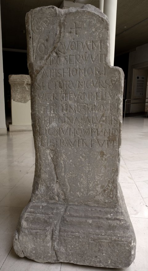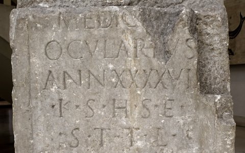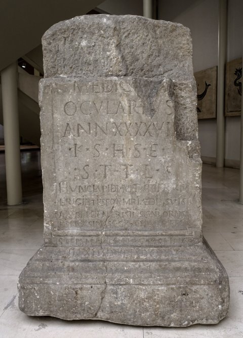 - D(is) M(anibus) s(acrum) / Albanius Artemidor(us) / medicus / ocularius / ann(orum) XXXXVI / k(arus) s(uis) h(ic) s(itus) e(st) / s(it) t(ibi) t(erra) l(evis)