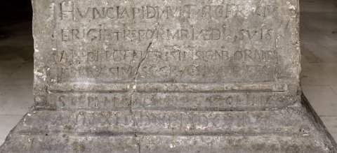 - Inschrift oben abgearbeitet, unterhalb der römischen Inschrift und auf den Nebenseiten Inschrift aus dem Jahr 1612