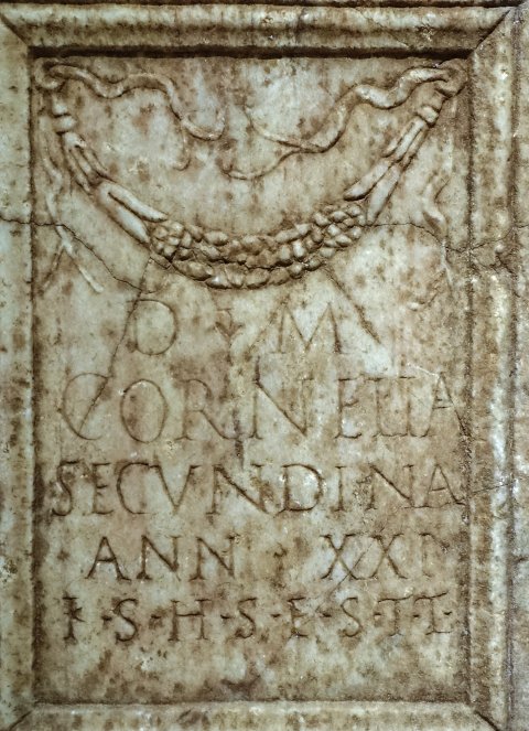 - D(is) M(anibus) / Cornelia / Secundina / ann(orum) XXI / k(ara) s(uis) h(ic) s(ita) e(st) s(it) t(ibi) t(erra) l(evis)
