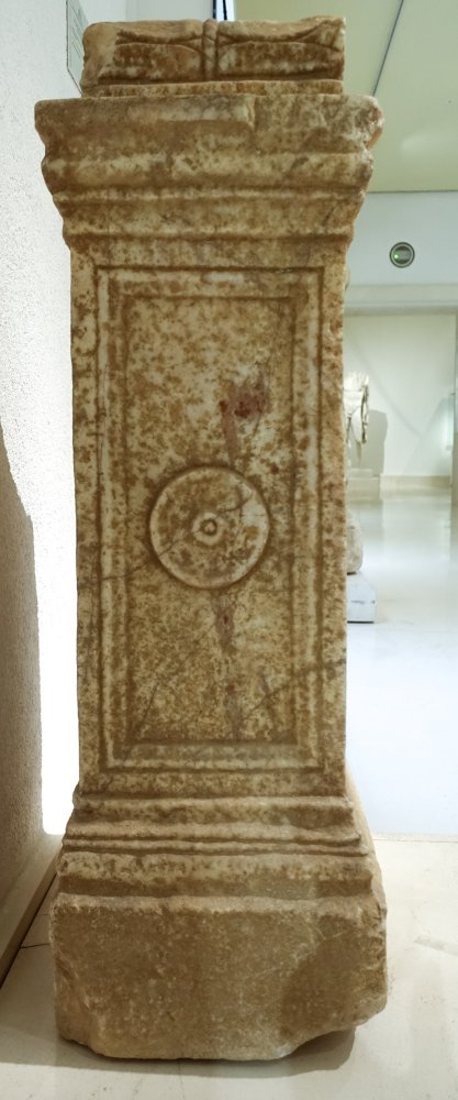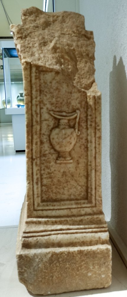 - Giebel zwischen geschnürten pulvini mit Rosetten, darunten profiliertes Gesims. Vorder- und Nebenseiten gerahmt, über der Inschrift Girlande mit Taenien, auf den Nebenseiten Gefäße (rechts Kanne, links patera).