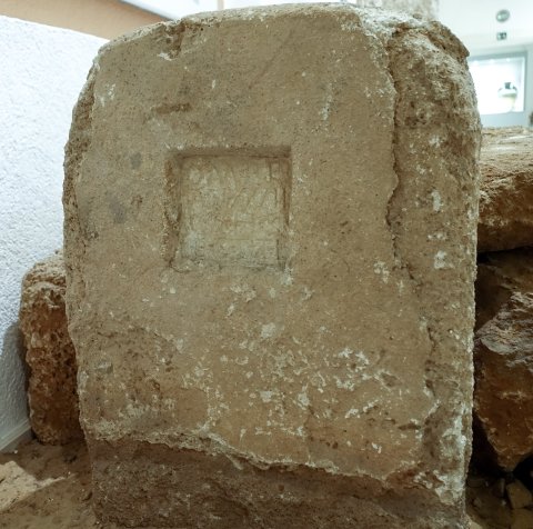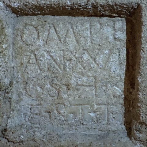 - Titulus in einem Steinblock mit abgerundeten oberen Ecken eingelassen
