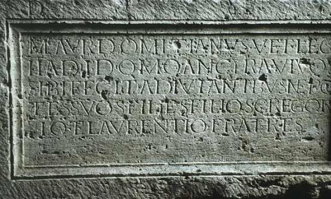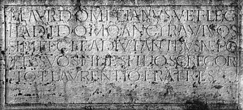 - D(is) M(anibus) / M(arcus) Aur(elius) Domitianus vet(eranus) leg(ionis) / II Adi(utricis) domo Ancyra vivos / sibi fecit / adiutantibus nepo/tes suos filies(!) filios Gregor/io et Laurentio fratres
