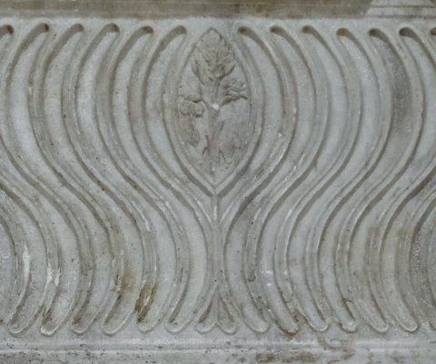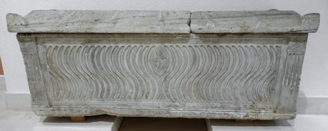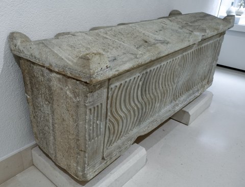 - Sarkophag mit dachförmigem Deckel mit Akroteren. Vorderseite des Kastens mit Riefeln zwischen kannelierten Pilastern. In der Mitte mandorlaförmiges Bildfeld mit Baum und Widder.