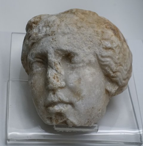 - nach links gedrehter Kopf einer Frau (Göttin ?) mit Diadem (?)