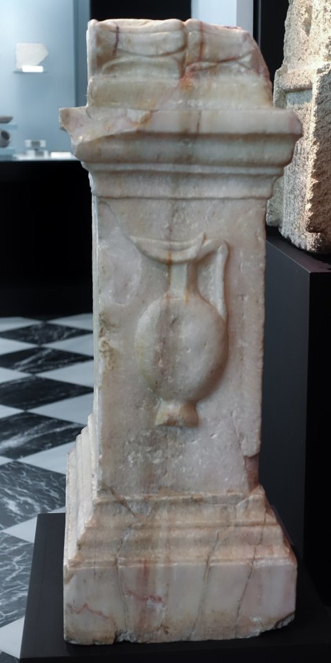 - Giebel mit Rosette zwischen geschnürten pulvini mit Rosetten. Auf den Nebenseiten Gefäße ( links patera, rechts Kanne).