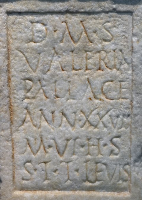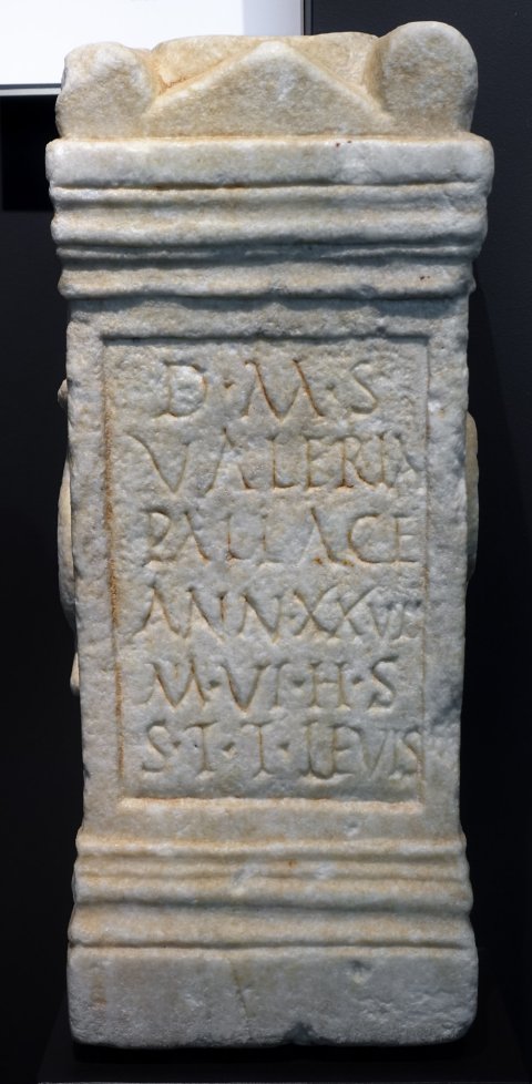 - D(is) M(anibus) s(acrum) / Valeria / Pallace / ann(orum) XXVII / m(ensium) VI h(ic) s(ita) / s(it) t(ibi) t(erra) levis