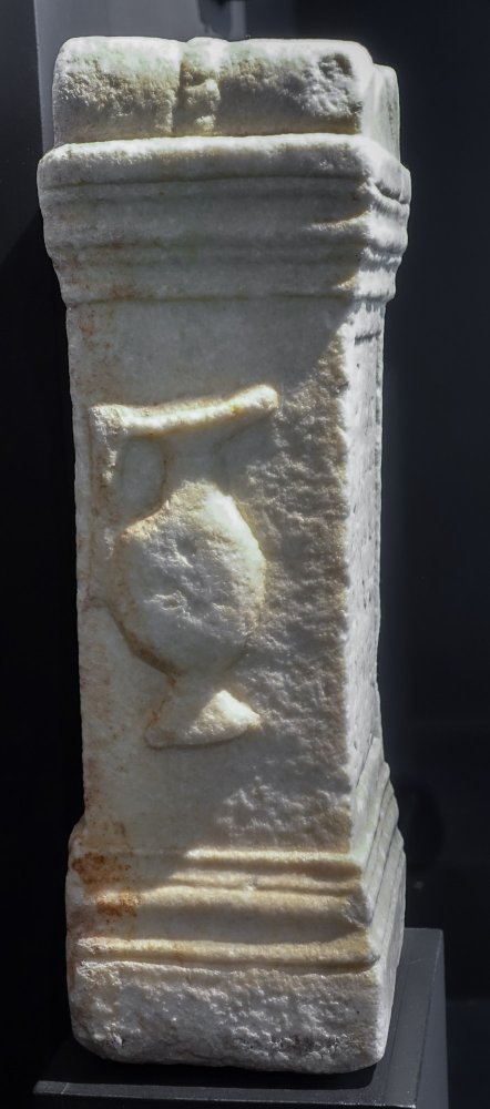 - Giebel zwischen geschnüten pulvini (unfertig), auf den Nebenseiten Gefäße (rechts patera mit Griff, links Kanne).