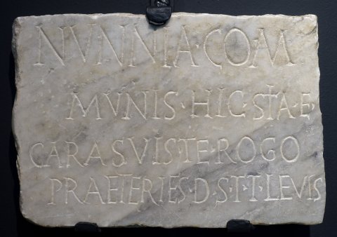 - Nunnia Com/munis hic sita e(st) / cara suis te rogo / praeterie(n)s d(icas) s(it) t(ibi) t(erra) levis