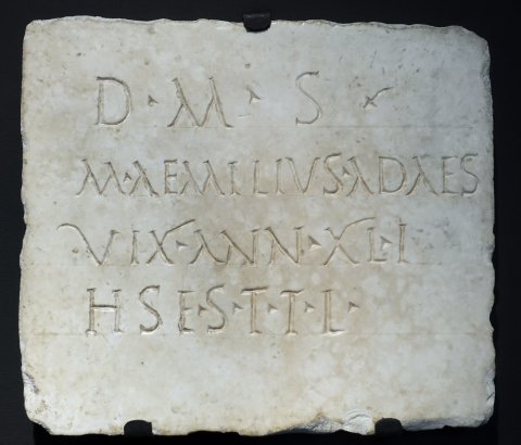 - D(is) M(anibus) s(acrum) / M(arcus) Aemilius Adaes / vix(it) ann(os) XLI / h(ic) s(itus) e(st) s(it) t(ibi) t(erra) l(evis)