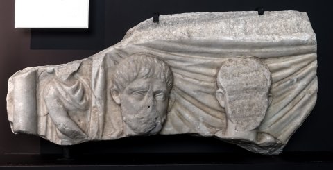- Familie. Vor einer von Genien gehaltenen Draperie zwei männliche Porträtköpfe (Reste von Brustbildern). Links bärtiger Mann, zu seiner Linken Kopf eines Jünglings (Vater und Sohn). Rechts weitere Person ? Seitlich des erhaltenen Genius Halbsäule.