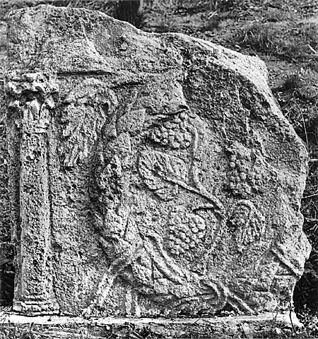 - Im Hauptbild zwischen Säulen Kranz mit Tänien, darin Weinranke. Auf dem Rahmen des Schriftfeldes Efeuranke.