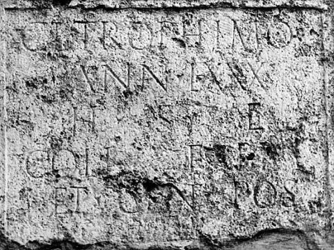 - Cl(audio) Trophimo / ann(orum) LXXX / h(ic) s(itus) e(st) / coll(egium) fabr(um) / et cent(onariorum) pos(uit)