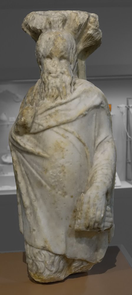 - Mythische Figur, Musikinstrument: bärtiger Pan mit Bocksbeinen und -ohren, im Manttel, in der Linken Syrinx. Auf der Rückseite Baumstamm mit stilisierter Krone als Tischfuß.