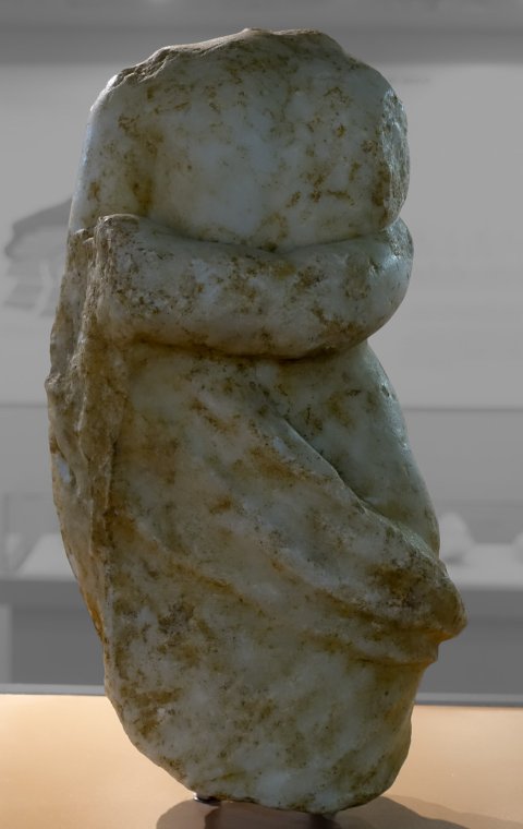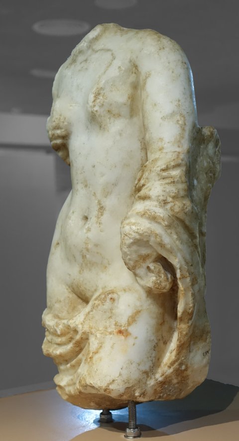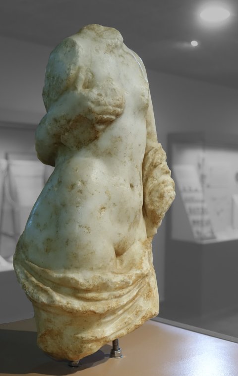 - Torso der Nymphe mit Teil der Oberschenkel, ohne Kopf u. rechten Arm, vom Satyr nur der rechte Arm erhalten