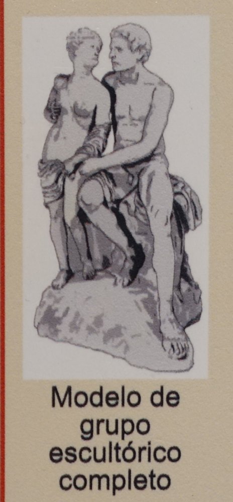 - Mythische Figuren: stehende Nymphe mit Mantel um Beine und linken Arm, auf ihrem Rücken der sie umschlingende Arm des an ihrer linken Seite auf Felsen sitzenden Satyrs.