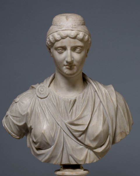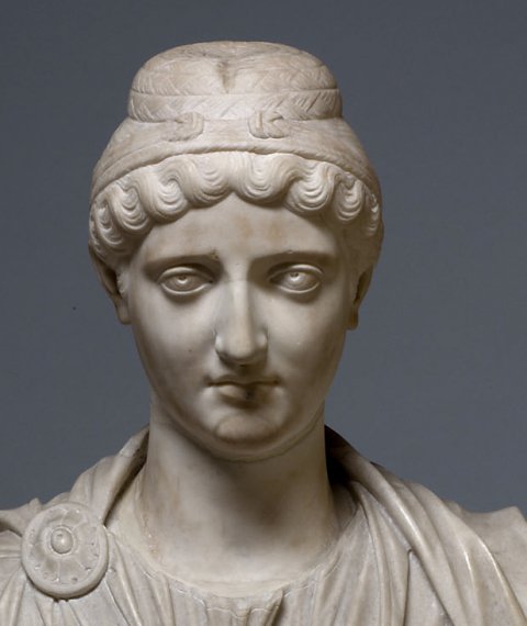 - Historische Person: Porträt der Faustina maior mit auf dem Oberkopf aufgesteckten Flechten und "Stirnrosetten".