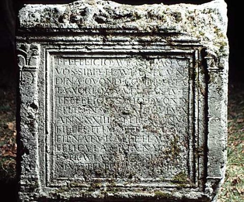 - D(is) M(anibus) // T(itus) Fl(avius) Felicio Aug(ustalis) col(oniae) Aq(uincensium) vi/vos(!) sibi et Flaviae Secun/dinae quond(am) conlibertae / et uxori quae vixit an(nos) LV et / T(ito) Fl(avio) Felicissimo quond(am) / filio naturali qui vixi(t) / ann(os) XXIII et T(ito) Fl(avio) Ingenuo / fil(io) legitimo et T(ito) Fl(avio) Felici / fil(io) naturali et Flaviae / Feliculae filiae naturali / et Flaviae Felicissimae nepti / vivis T(itus) Fl(avius) Felicio s(upra) s(criptis) et sibi f(aciendum) c(uravit)