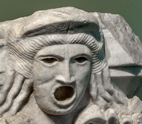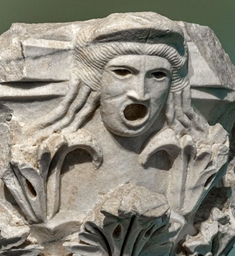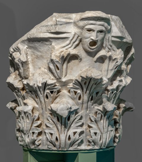 - Korinthisches Kapitell, am Abacusrand tragische Maske