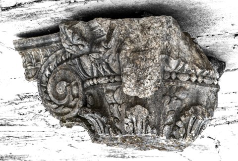 - Kompositkapitell mit Akanthusblattkranz, Perlstab, Eierstab, Voluten mit Akanthusblättern.