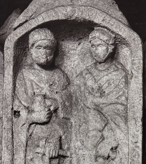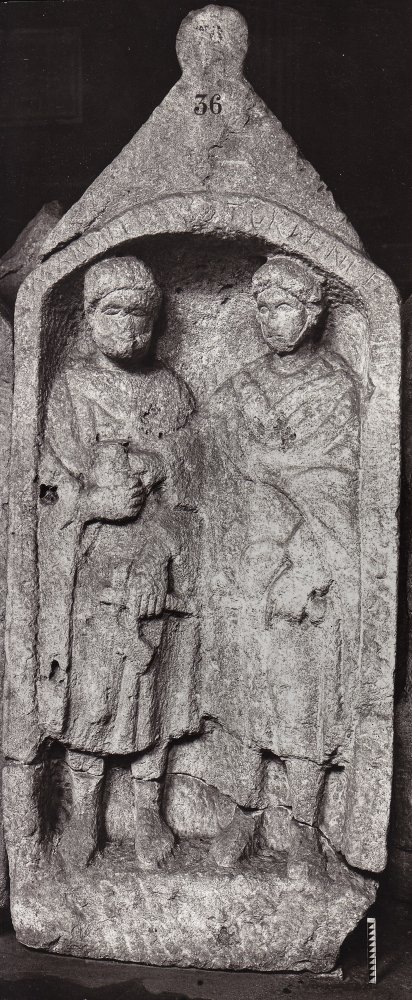 - Bildnische mit flachem Bogenabsachluss, darüber rahmenloser Giebel mit Knauf auf der Spitze. Zwei ganzfigurige stehende, bärtige Männer in halblangen Mänteln. Der linke hält Becher und ascia, der Rechte ein halbmondförmiges Ledermesser. Inschrift auf dem Bogenrahmen.
