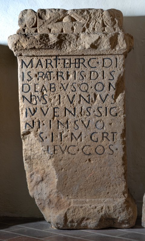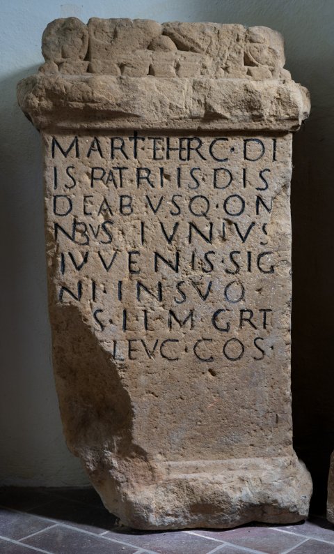 - [I(ovi) O(ptimo)] M(aximo) Iun(oni) Reg(inae) // Marti et Herc(uli) di/is(!) patriis dis / deabusq(ue) om/nibus Iunius / Iuvenis sig/ni(fer) in suo / [v(otum)] s(olvit) l(ibens) l(aetus) m(erito) Gr(a)to / [et S]eleuc(o) co(n)s(ulibus)