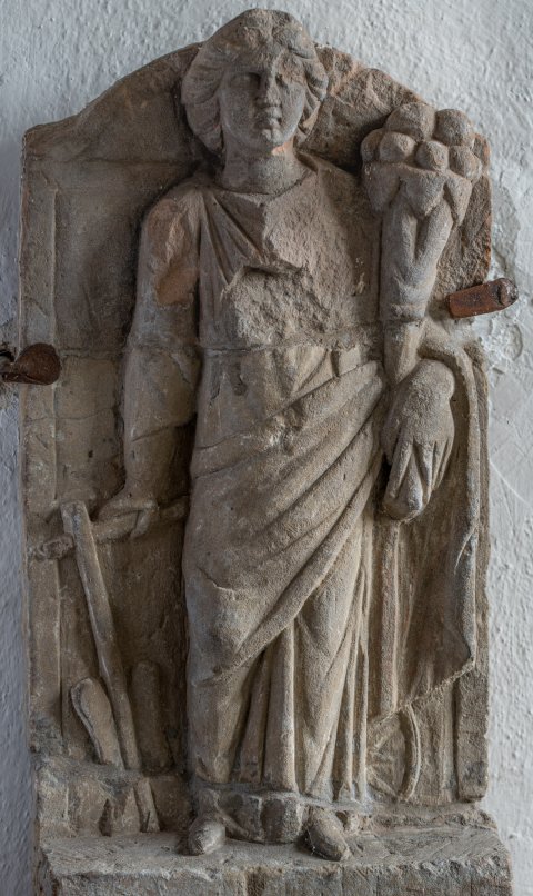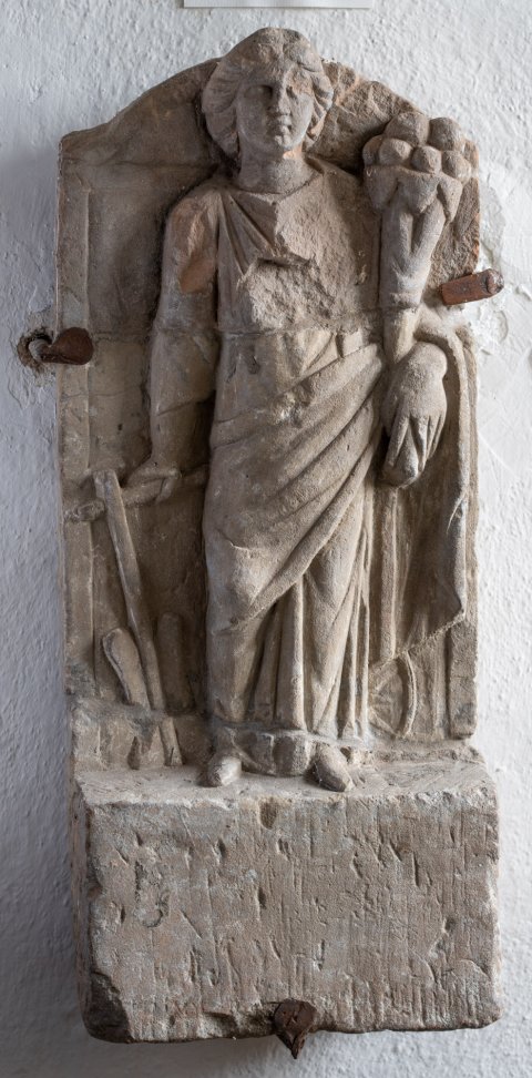 - Mythische Figur: frontal stehende Fortuna mit Füllhorn im linken Arm, die rechte Hand hält Steuerruder, hinter dem linken Bein Rad. Reliefgrund seitlich und oben gerahmt, oben bogenförmig, unten vprspringender Block.