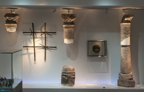 - 2 Kapitelle, 1 Basis, 2 Teile einer Säule mit Kapitell und Basis