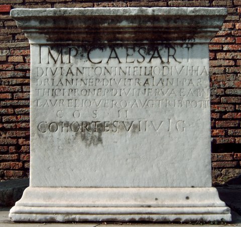 - Imp(eratori) Caesari / divi Antonini filio divi Ha/driani nep(oti) divi Traiani Par/thici pronep(oti) divi Nervae abn(epoti) / L(uci) Aurelio Vero Aug(usto) trib(unicia) pot(estate) II / co(n)s(uli) II / cohortes VII vig(ilum)