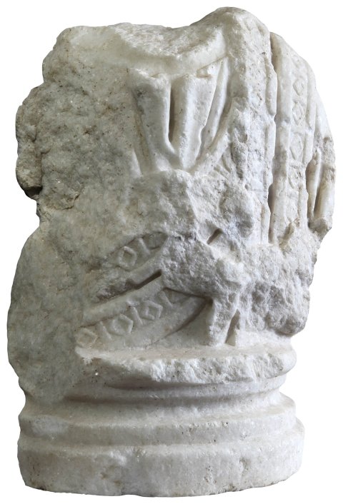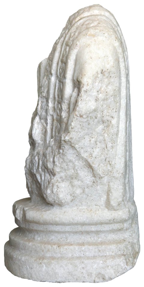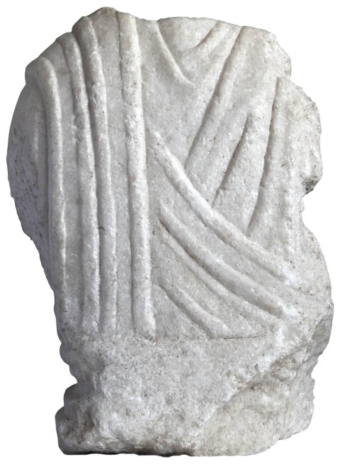 - Unterlebensgroße bekleidete weibliche (?) Büste auf einfach profiliertem runden Sockel, Mantel über der linken Schulter mit ornamentierten Borten. Standfläche grob gespitzt.