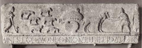 Auf Pedum gelehnter Hirte im Mantel, vor ihm Schafherde; zweirädriger Karren mit verschnürtem Ballen, gezogen von zwei Maultieren, die ein Mann am Zügel hält; ganz rechts stehende Person im langen Gewand.