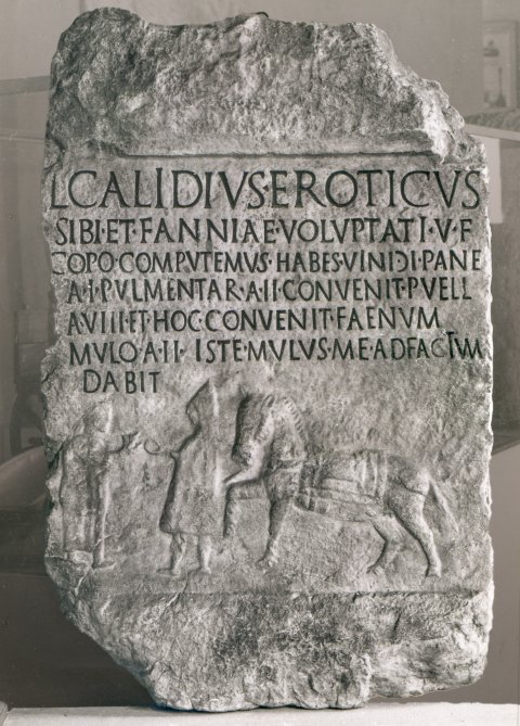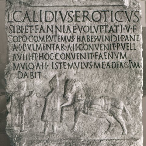 - L(ucius) Calidius Eroticus / sibi et Fanniae Voluptati v(ivus) f(ecit) / copo, computemus habes vini ((sextarium)) I pane(m) / a(sse) I pulmentar(ium) a(ssibus) II convenit puell(am) / a(ssibus) VIII et hoc convenit faenum / mulo a(ssibus) II iste mulus me ad factum dabit