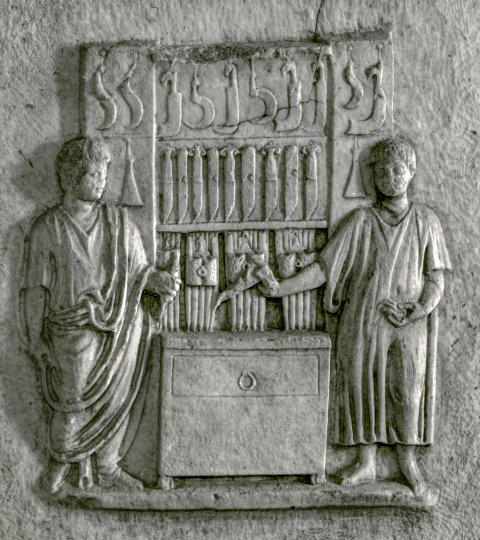 Rechte Nebenseite: Laden für Eisenwaren, in der Mitte Truhe, darüber aufgehängte Sicheln und Rebmesser, in Regalfächern Dolche und Messer in Futteralen. Rechts stehender Händler in Ärmeltunica mit Messer in der Rechten, links Kunde (Togatus).