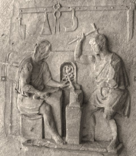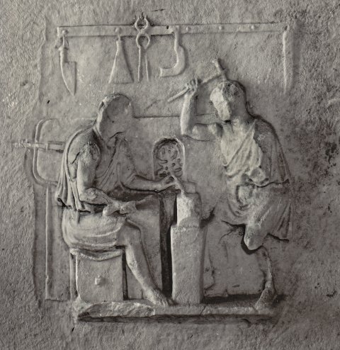 Linke Nebenseite: Werkstatt des Eisenwarenhändlers, links am Amboss sitzender Arbeiter mit Werkzeug in den Händen, rechts stehender mit erhobenem Hammer. Beide in kurzer Tunica mit entblößter Schulter. Im Hintergrund Ofen und Blasebalg, darüber an einer Stange hängende Werkzeuge. Die Reliefs der Nebenseiten sind bis auf eine Standleiste rahmenlos.
