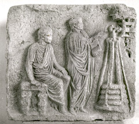 Eckblock. Auf der Vorderseite neben einer großen Waage stehender Mann (Togatus ) mit offenem Diptychon in der Linken, die rechte Hand zum Waagbalken erhoben. In der Waagschale mehrere runde Objekte. Hinter dem Stehenden auf einem Hocker sitzender Mann in Tunica und Toga.