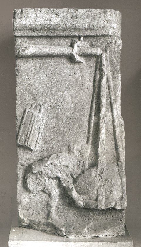 - Waagbalken mit rechter Waagschale. Ein Diener in kurzer Tunica hält mit beiden Händen die Schale, auf der halkugeliges Objekt liegt. Über ihm hängendes Diptychon. Unten Standleiste, oben einfach profilierter Rahmen.