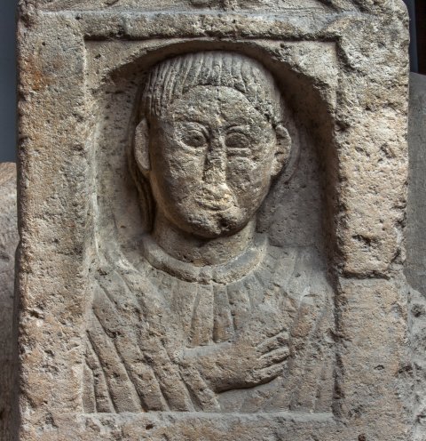 - Stele mit gerahmtem Giebel mit Rosette, Bildnische mit Bogenabschluss, darin Brustbild eines bartlosen Mannes mit Torques.