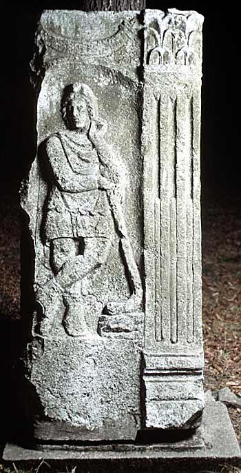 - Auf der Außenseite mythische Figur : in Bogennische zwischen Pilastern Attis mit phrygischer Mütze, Mantel, Schuhen, auf Hirtenstab (Pedum) gestützt. Über dem Bogen Girlande.