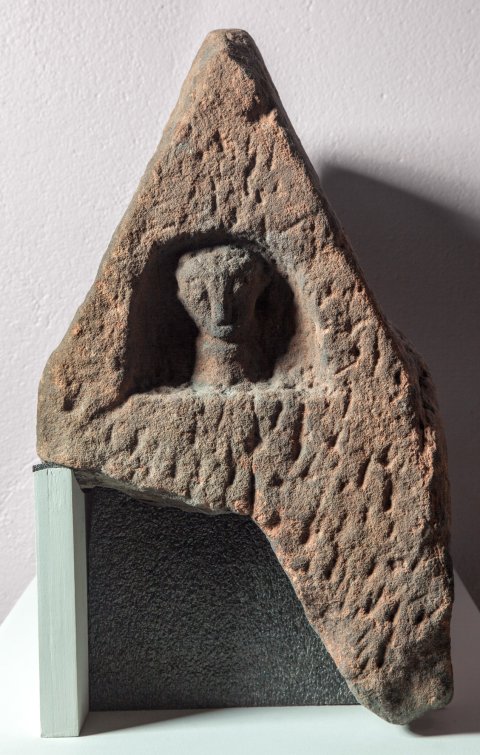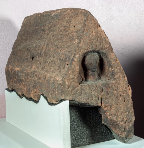 - Hausförmiger Stein mit steilen Satteldach, auf der Vorderseite unter dem Giebel Bogennische mit Halsbüste eines Mannes.