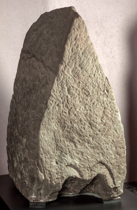 - Grabstein in Form eines Hauses mit steilem Satteldach und zwei kleinen Bogennischen an der Unterkante der Frontseite.