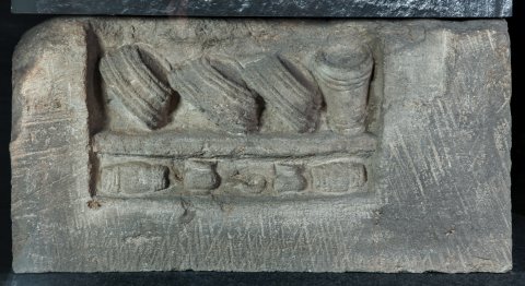 - Eckiges Bildfeld mit Gefäßen auf einem Regal (unten kleine Becher, darüber drei Körbe und ein Eimer). Bei der Auffindung waren seitlich des Reliefs noch Basen einer Pilastergliederung erhalten und der Stein war wesentlich tiefer als im heutigen Zustand.