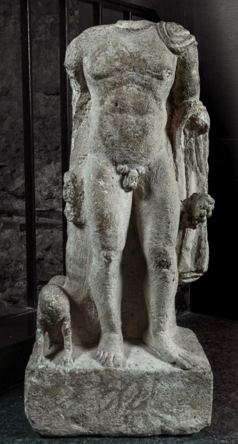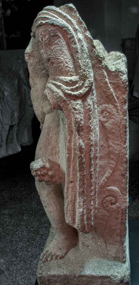 - Mythische Figur: vor einem Pfeiler auf kubischem Sockel stehender jugenlicher nackter Dionysos-Bacchus, Mantel über linker Schulter und Arm, neben dem linken Knie Weintraube (von der verlorenen linken Hand), neben dem rechten Bein stehender Panther. Auf den Seiten des Pfeilers links Stab mit Spitze unten (Waffe ? Thyrsos ?), rechts Spiralornament.