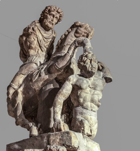 - Mythische Figuren: glatter Säulenschaft, korinthisches Kapitell mit Büsten der Jahreszeiten, darüber eckige Basisplatte mit Statuette des über einen aufgerichtenen Giganten hinweg reitenden Jupiter.