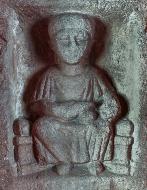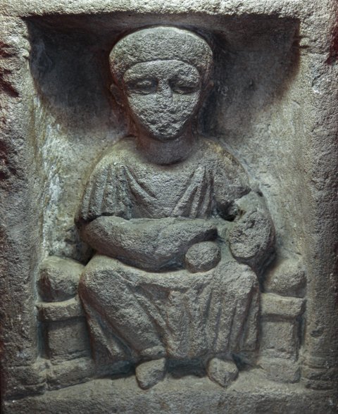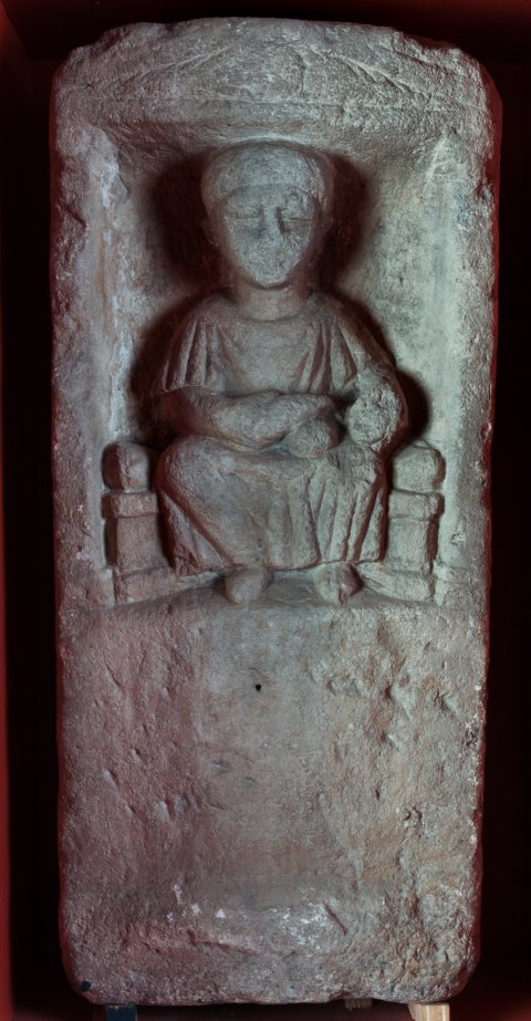 - Mythische Figur: thronende Muttergöttin mit Haube (?), Ärmeltunica, auf den Knien Wickelkind ? (Früchte ?). Oben Giebel mit Rosette zwischen Blättern.