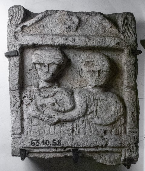- Giebel mit Seitenakroteren und Rosette. Im Hauptbild zwei Halbfiguren (Ehepaar). Links einheimische Frau: Haube, Flügelfibeln, Torques, Armreifen, in der Linken Apfel. Rechts Mann: bartlos, Mantel, in der Linken kleines Beil.