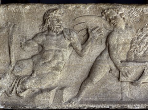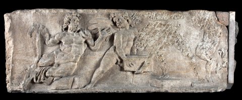Mythische Figuren: auf einer Längsseite links gelagerter bärtiger Gott (Neptun ?), nackt bis Mantel um Beine und auf linker Schulter, rechte Hand auf einem Anker, Kopf nach rechts gewandt, linke Hand erhoben zu zwei Eroten, die eine Kiste aufheben. Zwei weitere Eroten bewegen sich nach rechts.