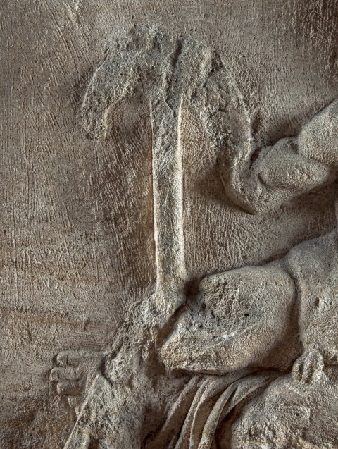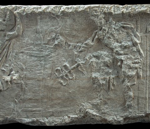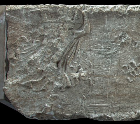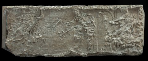 Auf der anderen Längsseite Mythos (?): von links heraneilender Mann im wehenden Mantel, linker Arm erhoben (zum tragen einer Last ? Reliefreste hinter seinem Kopf). Vor ihm Altar oder Pfeiler, auf dem eine schlanke Flasche steht, neben und hinter dem Altar kleine Bäume. Rechts vom Altar Mercur mit hochgestelltem rechten Bein, rechter Arm zum Altar ausgestreckt, in der auf das Knie gestützten Linken geflügelter Caduceus. Rechts hinter Mercur Architektur mit Bogenöffnung, Ganz rechts auf Felsen gelagerte bekleidete Person, die vorgestreckte Rechte hält langen gebogenen Stab.