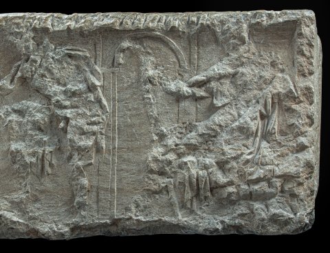 - Reliefs tlw. abgearbeitet, 1 Schmalseite mit anschließendem Teil der Längswände fehlt